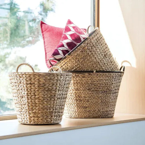 Matière : Jacinthe d’eau tressée à la main | Couleur : Naturel | Equipé de deux anses | Taille max bûches : 40 cm | Tenue : rigide